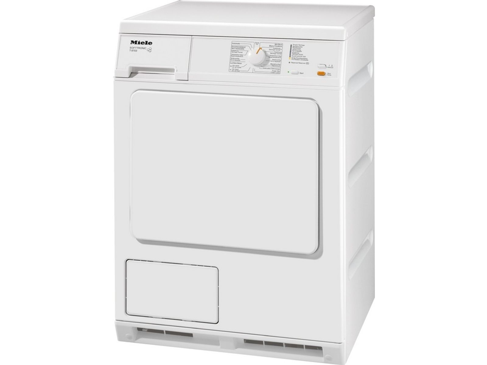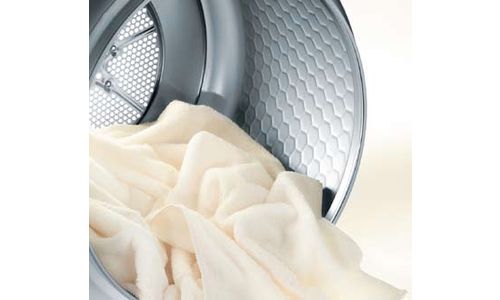 Condensdroogkast met een schuin geplaatst bedieningspaneel. Biedt een SoftCare trommel van 7 kg met een (naar buiten gewelfde) honingraatstructuur, zodat in de kuiltjes een luchtkussen ontstaat dat de was na de zweeffase door de warme luchtstroom zacht opvangt. Zo wordt uw wasgoed daadwerkelijk voor slijtage behoed en zal het na het drogen ook veel minder kreuken. En des te makkelijker is het daarna te strijken. De was wordt tevens verder mee naar boven gevoerd. Dit resulteert in een langere zweeffase door de warme luchtstroom en een verbeterde uitwisseling van lucht en vochtigheid. Hierdoor wordt de was gelijkmatiger gedroogd en aan een lagere mechanische belasting blootgesteld.