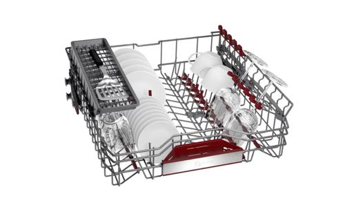 Creëer geriefelijke ruimte in een fractie van een seconde en verander het derde niveau in een veelzijdige bovenverdieping: ga voor de optionele Flex 3e mand met zijn schuifelement voor extra kopjes en kommen of kies onze Flex-besteklade voor bestek. Je servies past mooi in de onderste korf met 8 neerklapbare rekken en in de bovenste korf met 6 neerklapbare rekken. Zachte siliconen schuifbeschermers houden je glazen in de bovenste korf vast, en een hoger frame in de onderste korf biedt stevige steun aan hoge voorwerpen zoals snijplanken. Ervaar hoe soepel de korf op de kogelgelagerde wieltjes in de kuip schuiven en bemerk de handige korfstoppers op de voorwielen die ervoor zorgen dat je de korf niet over de deur trekt.